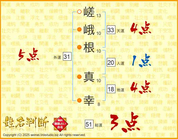 嵯(13画)峨(10画)根(10画) 真(10画)幸(8画)