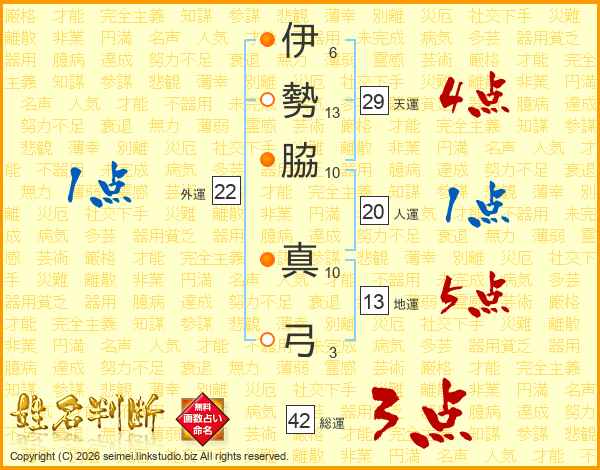 伊(6画)勢(13画)脇(10画) 真(10画)弓(3画)