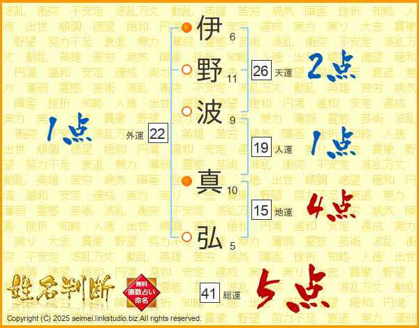 伊(6画)野(11画)波(9画) 真(10画)弘(5画)