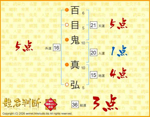 百目鬼真弘さんの外運は16画の5点!