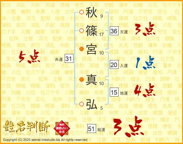 秋(9画)篠(17画)宮(10画) 真(10画)弘(5画)