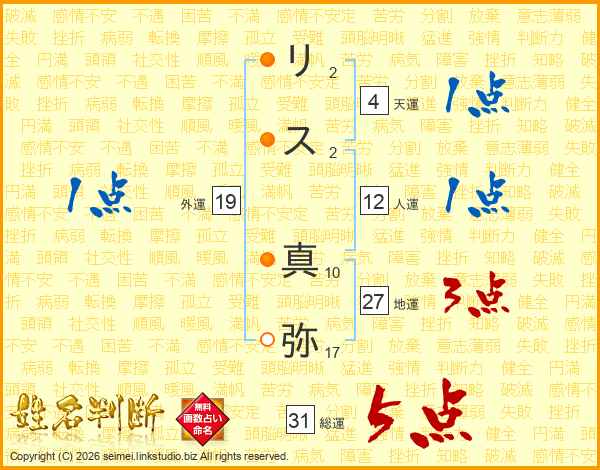 リ(2画)ス(2画) 真(10画)弥(17画)