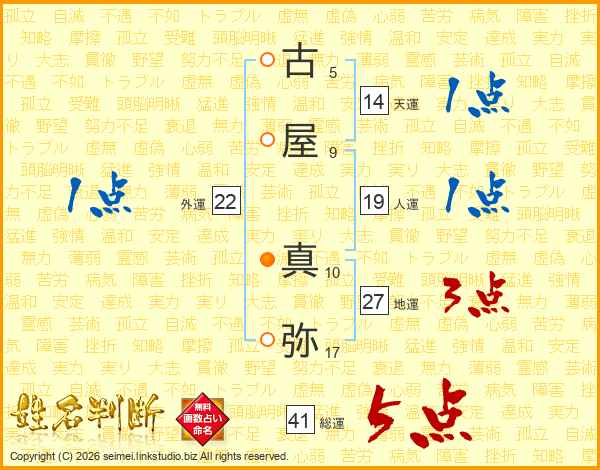 古(5画)屋(9画) 真(10画)弥(17画)
