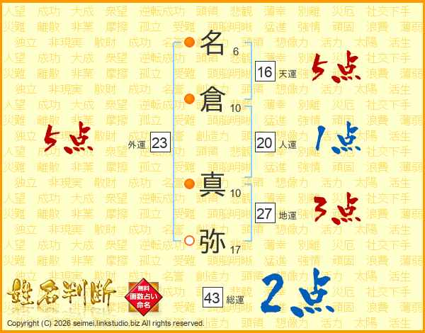 名(6画)倉(10画) 真(10画)弥(17画)
