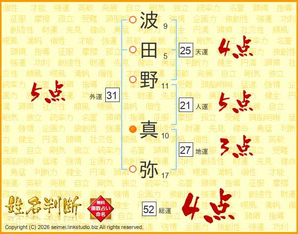 波(9画)田(5画)野(11画) 真(10画)弥(17画)