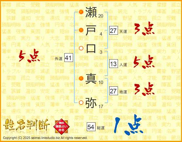 瀬(20画)戸(4画)口(3画) 真(10画)弥(17画)