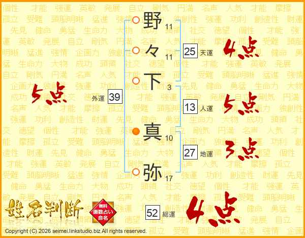 野々下真弥さんの総運は52画の4点!