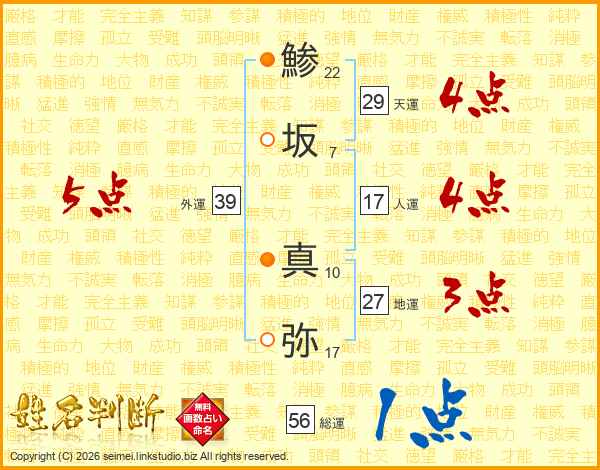 鯵(22画)坂(7画) 真(10画)弥(17画)