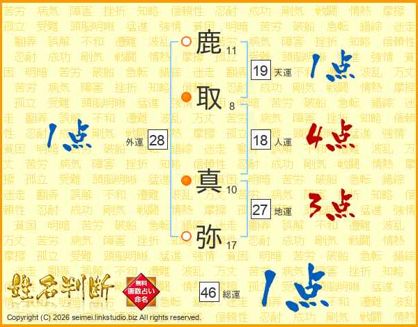 鹿(11画)取(8画) 真(10画)弥(17画)