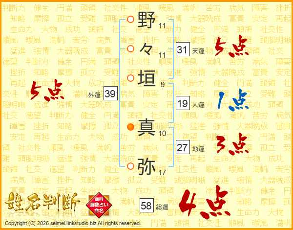 野(11画)々(11画)垣(9画) 真(10画)弥(17画)