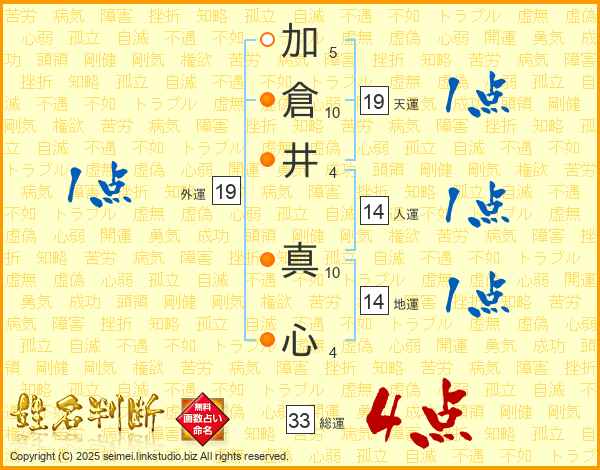 加(5画)倉(10画)井(4画) 真(10画)心(4画)