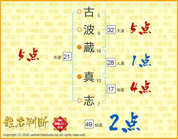 古(5画)波(9画)蔵(18画) 真(10画)志(7画)