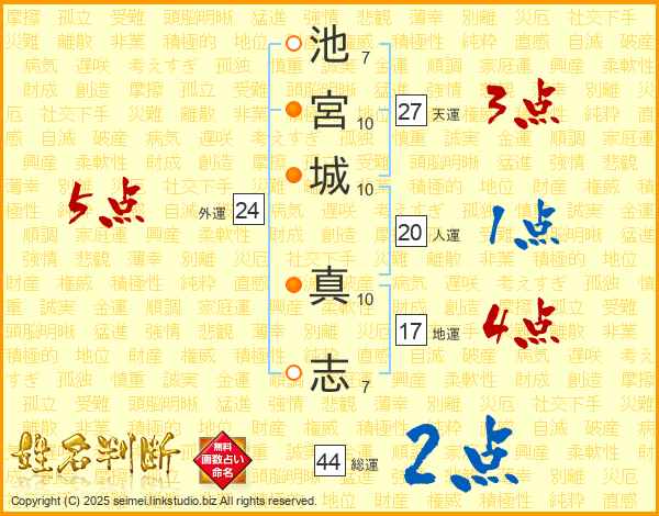 池(7画)宮(10画)城(10画) 真(10画)志(7画)