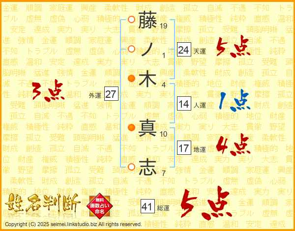 藤(19画)ノ(1画)木(4画) 真(10画)志(7画)