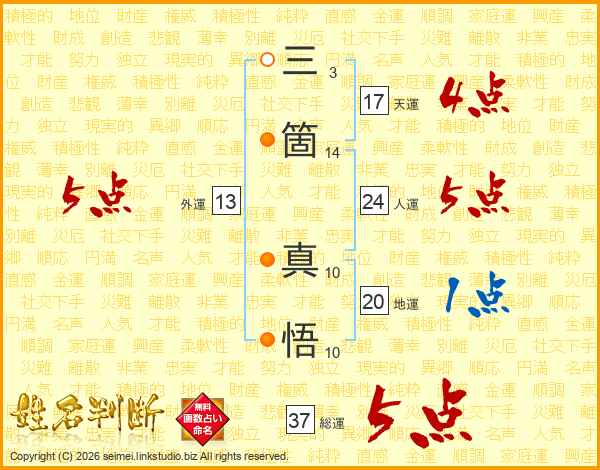 三箇真悟さんの総運は37画の5点!