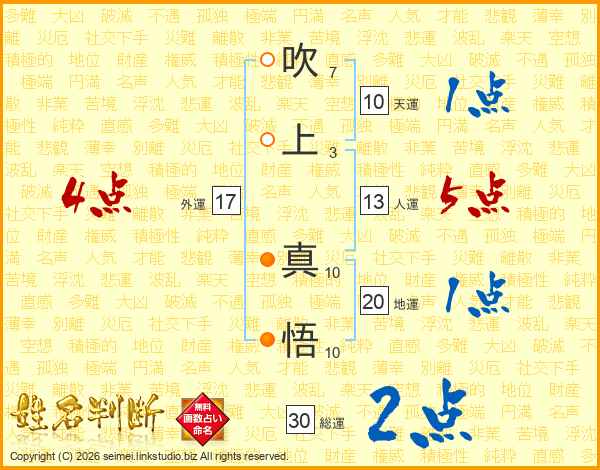 生活面を象徴する運勢です。外部から受ける影響力を表し、結婚運、家庭運や職場、環境への順応性を表します。総運から人運を引いた画数。姓や名が1文字の場合を除く。