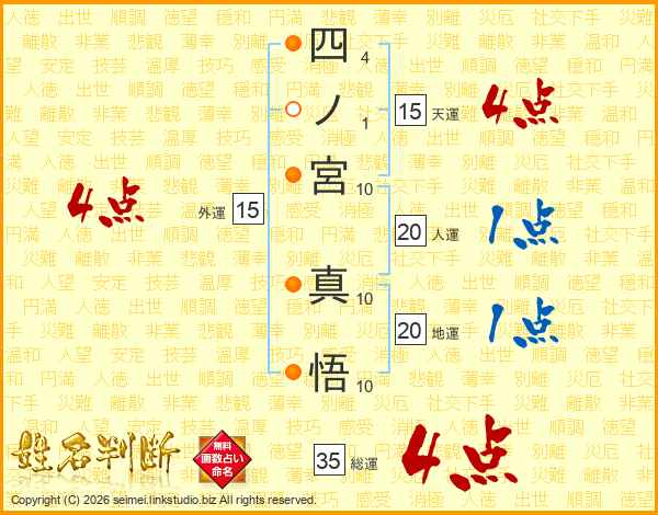 四(4画)ノ(1画)宮(10画) 真(10画)悟(10画)