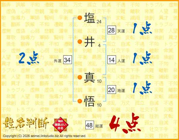 生活面を象徴する運勢です。外部から受ける影響力を表し、結婚運、家庭運や職場、環境への順応性を表します。総運から人運を引いた画数。姓や名が1文字の場合を除く。