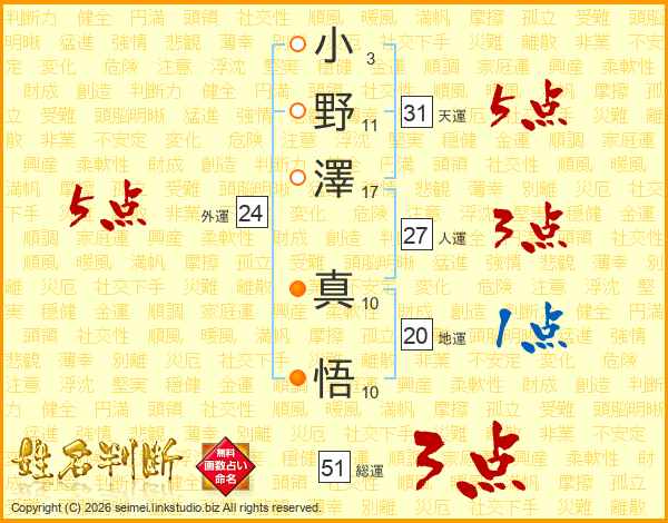 小(3画)野(11画)澤(17画) 真(10画)悟(10画)