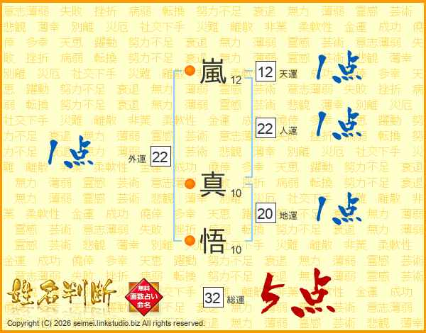 あなたの人生を表す1番重要な運勢です。生涯を通じて影響する総合運となり、主に50歳以降の晩年期に影響を及ぼします。苗字と名前の合計画数。