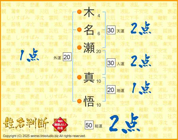 木(4画)名(6画)瀬(20画) 真(10画)悟(10画)