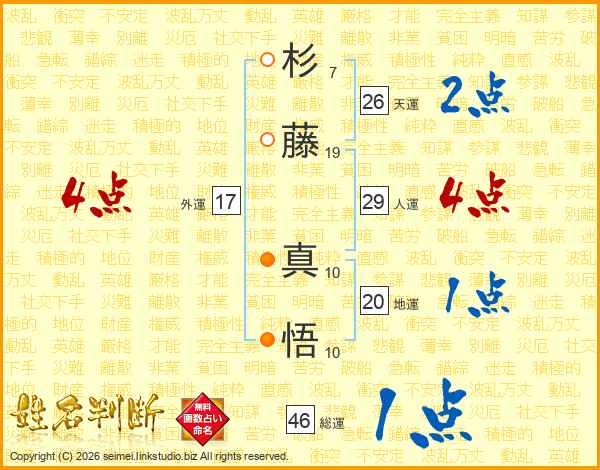 杉(7画)藤(19画) 真(10画)悟(10画)