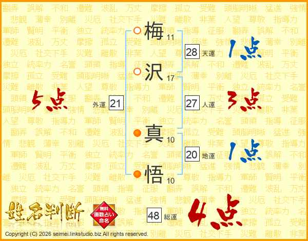 梅(11画)沢(17画) 真(10画)悟(10画)