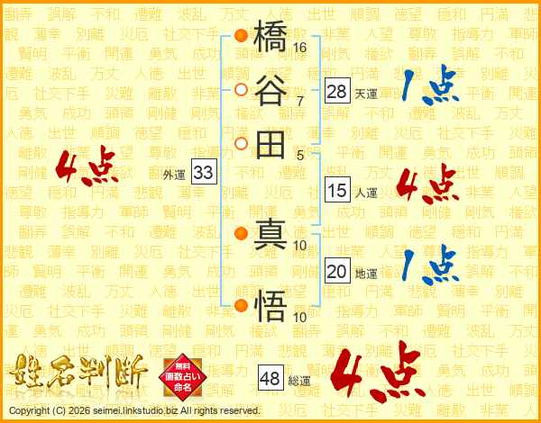 橋(16画)谷(7画)田(5画) 真(10画)悟(10画)