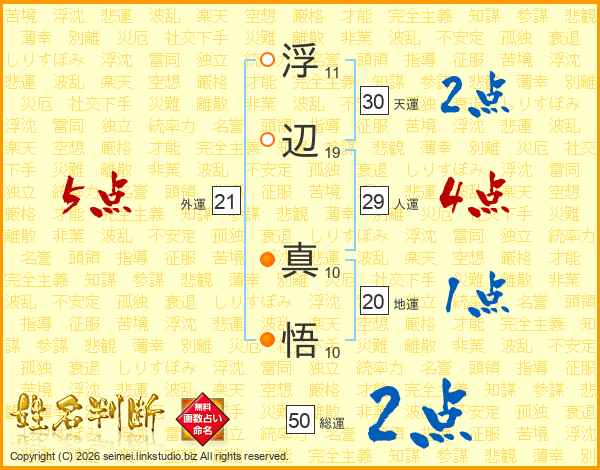 浮(11画)辺(19画) 真(10画)悟(10画)