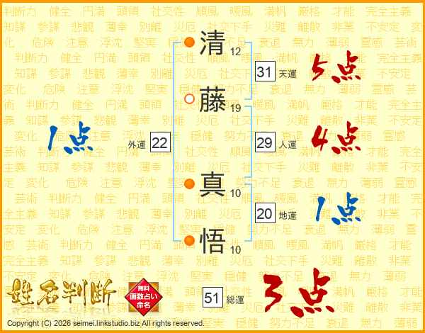 あなたの人生を表す1番重要な運勢です。生涯を通じて影響する総合運となり、主に50歳以降の晩年期に影響を及ぼします。苗字と名前の合計画数。