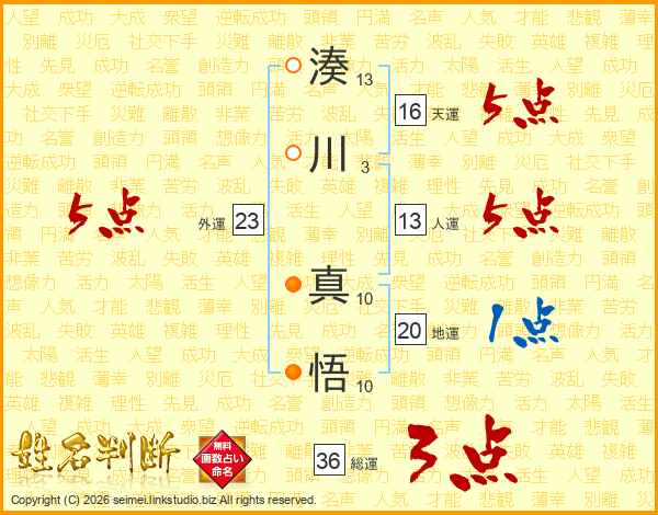 湊(13画)川(3画) 真(10画)悟(10画)