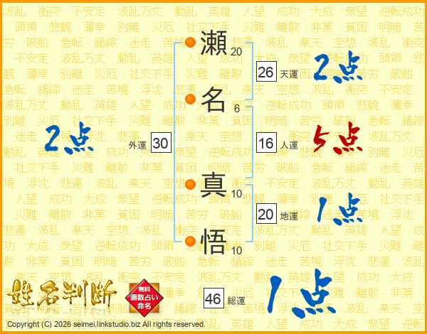 瀬名真悟さんの総運は46画の1点!