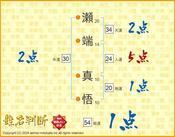 瀬(20画)端(14画) 真(10画)悟(10画)