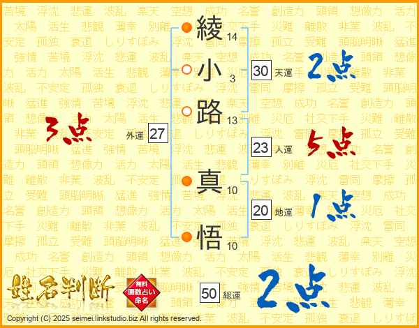 綾(14画)小(3画)路(13画) 真(10画)悟(10画)
