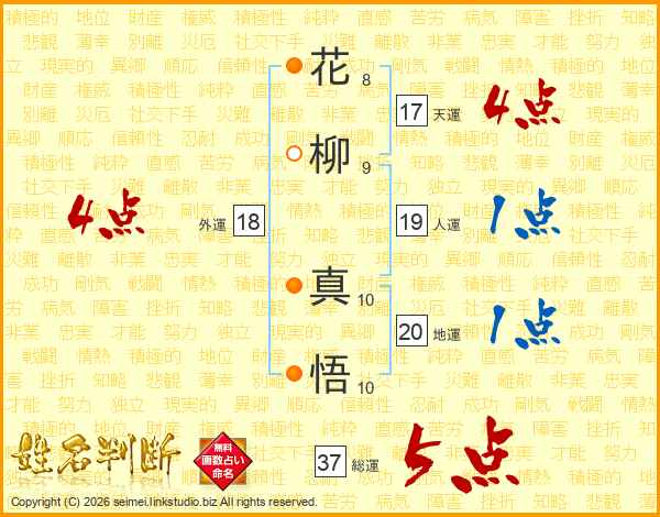 生活面を象徴する運勢です。外部から受ける影響力を表し、結婚運、家庭運や職場、環境への順応性を表します。総運から人運を引いた画数。姓や名が1文字の場合を除く。