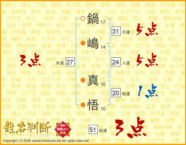 鍋(17画)嶋(14画) 真(10画)悟(10画)