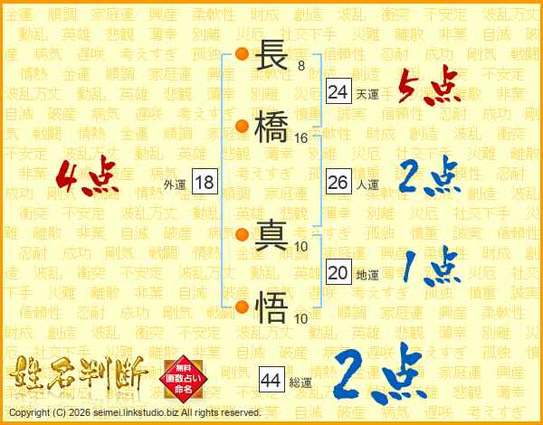 長(8画)橋(16画) 真(10画)悟(10画)