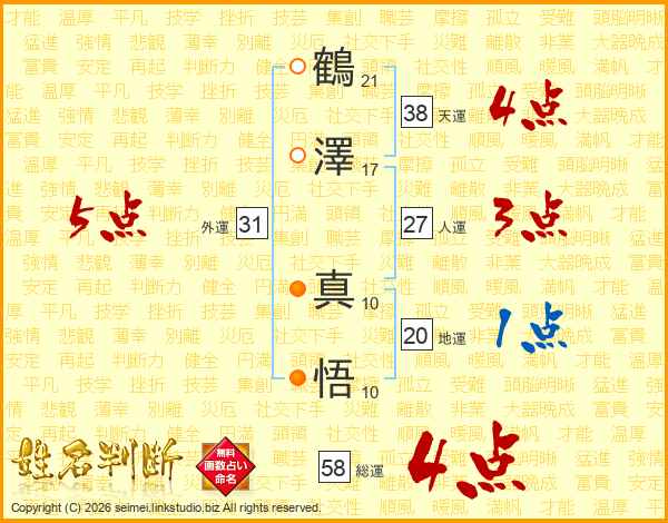 鶴(21画)澤(17画) 真(10画)悟(10画)