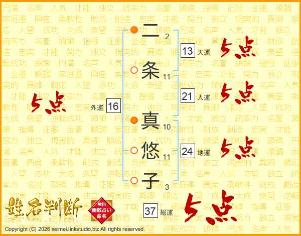 二条真悠子さんの総運は37画の5点!
