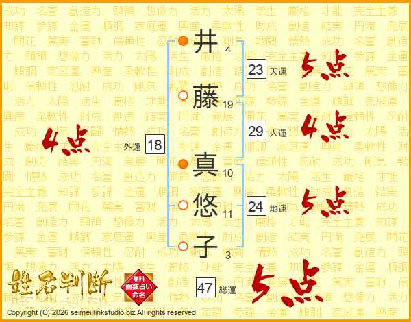 井(4画)藤(19画) 真(10画)悠(11画)子(3画)