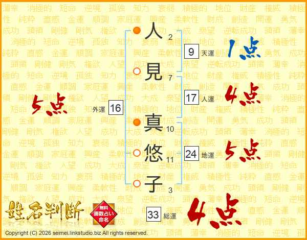 人(2画)見(7画) 真(10画)悠(11画)子(3画)