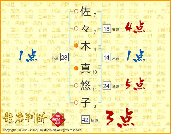 佐(7画)々(7画)木(4画) 真(10画)悠(11画)子(3画)