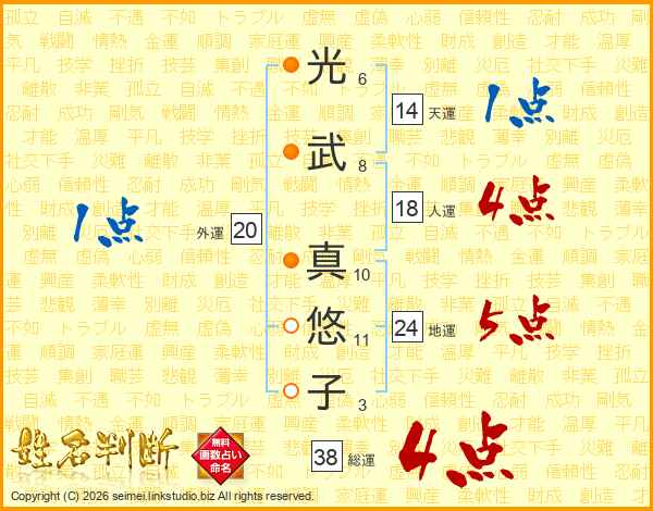 光(6画)武(8画) 真(10画)悠(11画)子(3画)