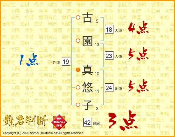 古(5画)園(13画) 真(10画)悠(11画)子(3画)