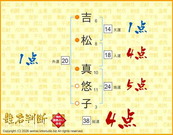 吉(6画)松(8画) 真(10画)悠(11画)子(3画)