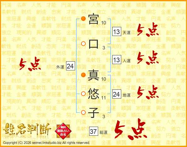 宮(10画)口(3画) 真(10画)悠(11画)子(3画)