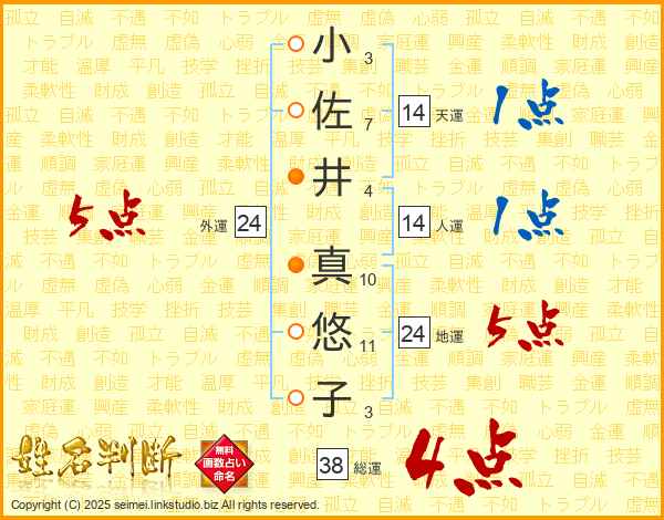 小(3画)佐(7画)井(4画) 真(10画)悠(11画)子(3画)