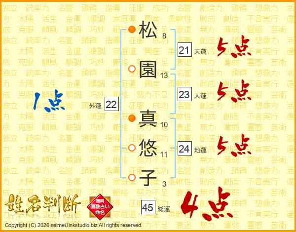 松(8画)園(13画) 真(10画)悠(11画)子(3画)
