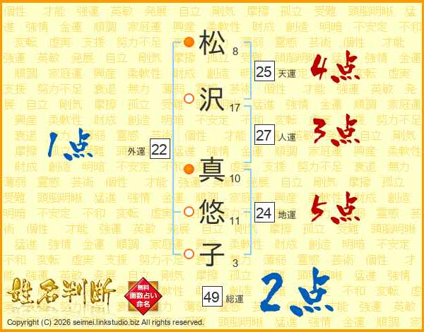 松(8画)沢(17画) 真(10画)悠(11画)子(3画)