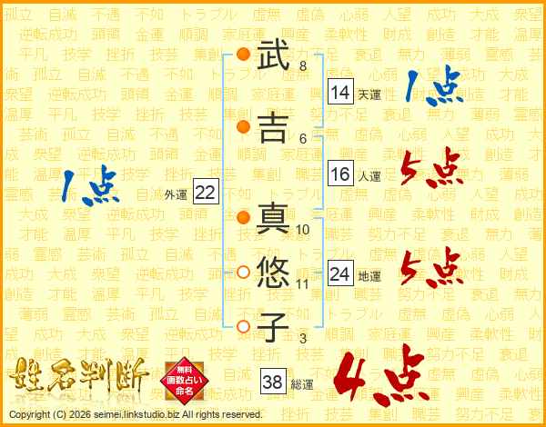 武(8画)吉(6画) 真(10画)悠(11画)子(3画)